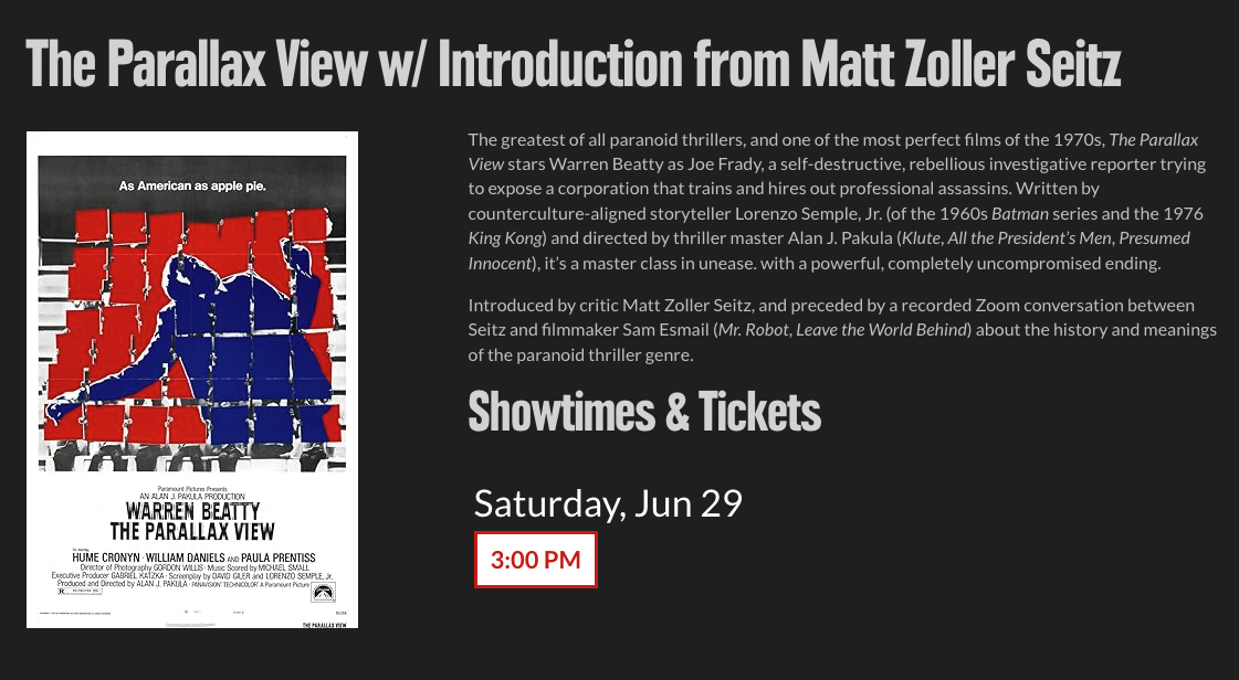 Matt is also hosting an upcoming screening of THE PARALLAX VIEW on June 29 at The Texas Theatre. Click the image below for more information.
