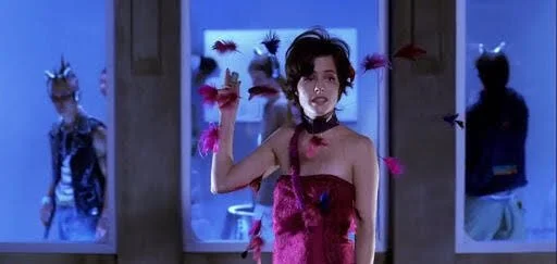 To demonstrate that Josie and the Pussycats are individuals, they look different from everyone else in the town. Their costumes lean harder into the post-grunge era, like stylish burn outs in a way, so that’s a darker palette: blacks, warm browns, maroons, greys. They have chunky foils in their hair in Josie’s case and twists verging on lite-dreadlocks in Melody’s, with Valerie’s natural hair bold and beautiful as it’s unleashed in full force. It’s in sharp juxtaposition to the dead straight, glossy locks of their tormentors. They have chains hanging from their pockets, everything is adorned with studs, there are chokers, tassels, random placement of fishnet, leather, velvet, sheer tops with black bras visible underneath, and boots: those with the thick heel and chunky sole in the era of Dr. Martens. This is their uniform before they’re “discovered” and it’s a capital L LOOK not dissimilar to the costumes worn in another movie that came out in 2001, six months after Josie: the very first Fast And Furious.
