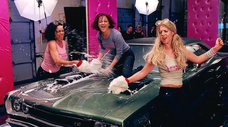 This quite unusual for the period, especially when you look at the most successful girl group in the world at that time: the Spice Girls. From their names – Baby, Scary, Sporty, Posh, Ginger – to the way they were styled, the intention was to set each girl apart from the other. Whereas Destiny’s Child’s tonal dressing – whether that was all jungle print or all purple, for instance – was intended to show that yes, okay, they were individuals but they were also collectively united as a group – a girl group! When the girls are the girls of Josie and the Pussycats and backed by a big, evil conglomerate in the film, they’re tonal dressing. They’re either all in varying leopard print, all in versions of a pastel metallics, all in garments in the pink and purple palette, all in shimmer like the Pretend To Be Nice video (which also has them all washing a car in a polished version of their earlier grunge aesthetic)